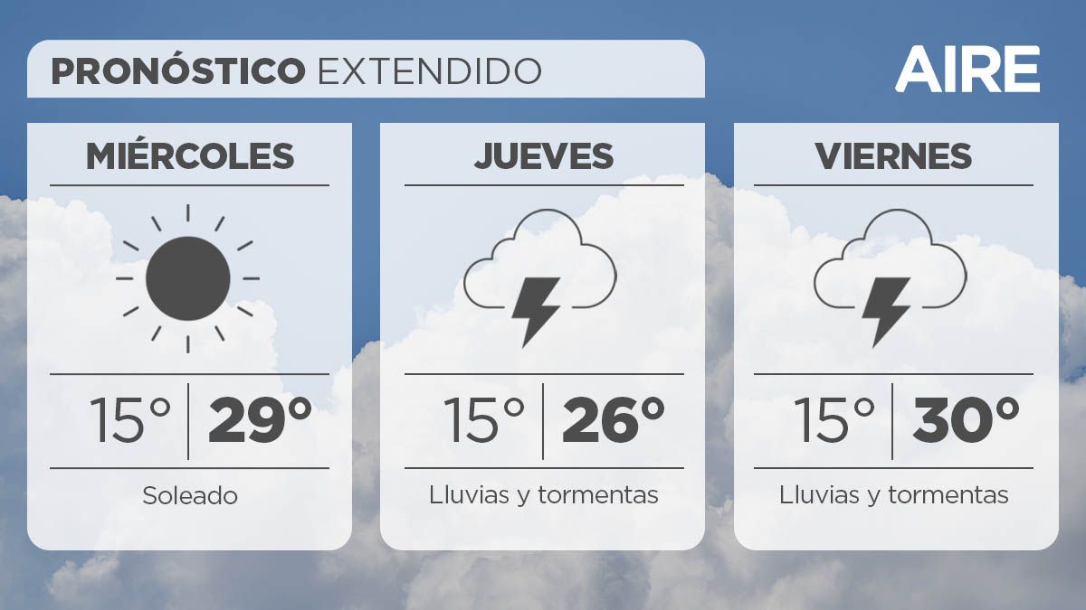 El jueves desde la madrugada se prevén lluvias y tormentas dispersas. Durante el día habrá algunos mejoramientos temporarios. La temperatura mínima será de 15° y la máxima de 26°, con viento leve a moderado del noreste.