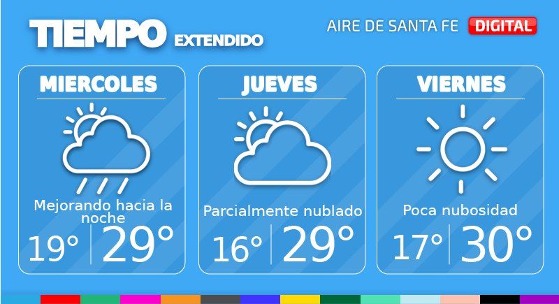 El pronóstico indica que el miércoles se mantendrán las condiciones inestables con probables lluvias y algunas tormentas, pero mejorando paulatinamente hacia la noche. Temperatura mínima de 19°, máxima de 29° y viento leve a moderado del sudeste con posibles ráfagas de mayor intensidad.
