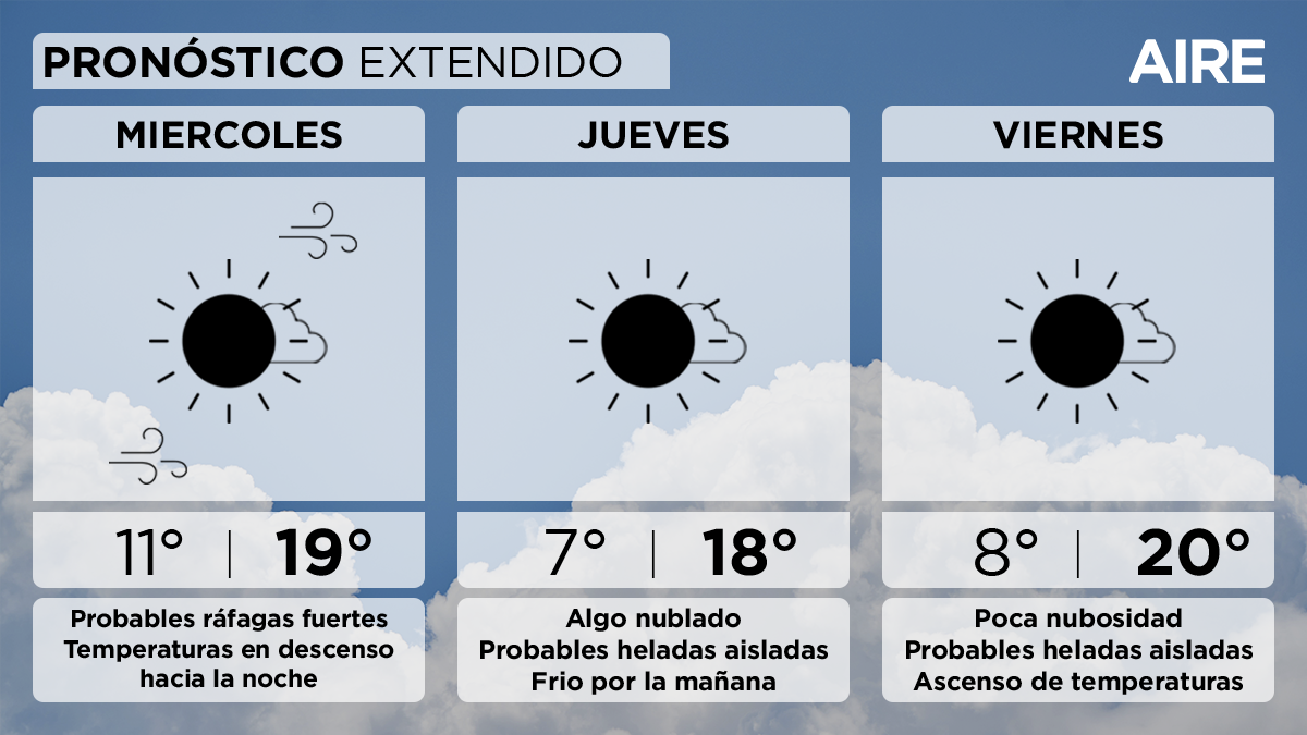 El jueves también estará el cielo algo nublado. La temperatura mínima será de 7° con posibles heladas en zonas con poca edificación, la máxima de 18° y con viento leve del sur rotando al noreste.