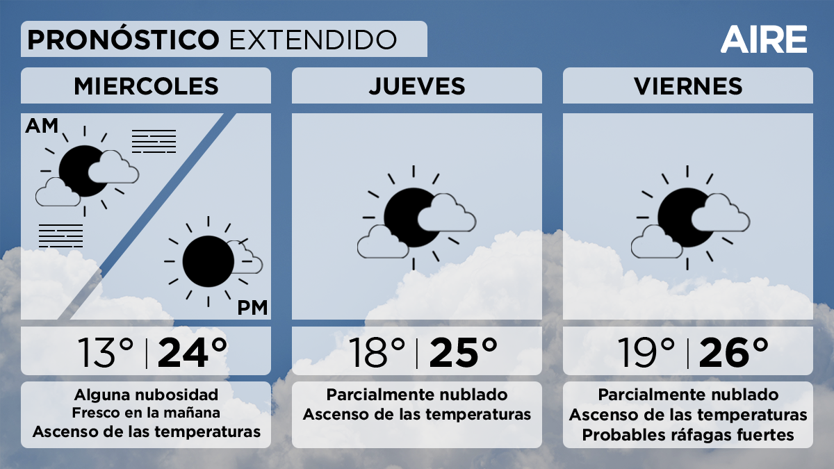 El viernes persistirá el cielo parcialmente nublado. Temperatura mínima de 19°, máxima de 26° y viento leve a moderado del noreste con probables ráfagas fuertes.