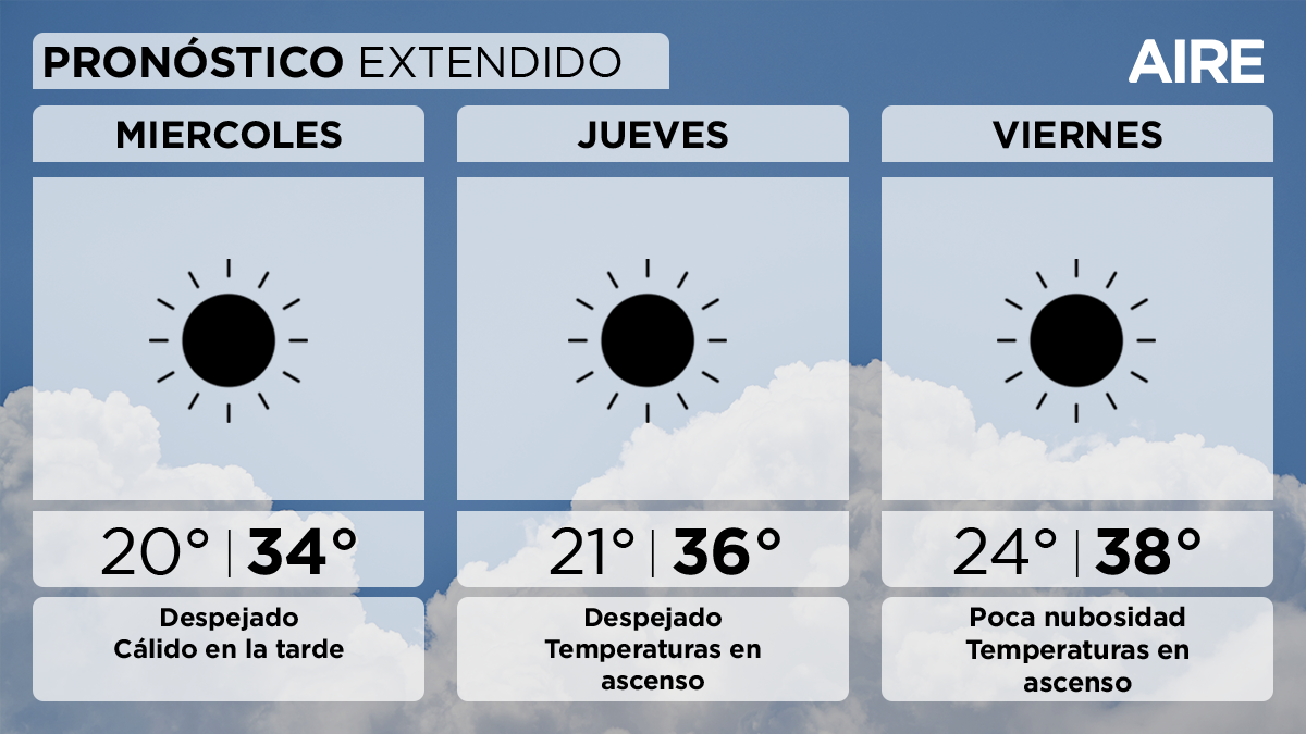 Para el jueves 5 de enero también se prevé cielo despejado y temperaturas que continuarán ascendiendo con mínima de 21°, máxima de 36° y viento leve del este.
