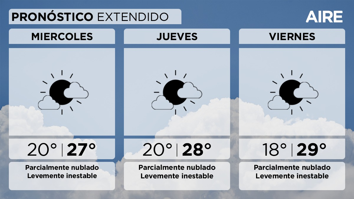 El jueves el cielo continuará parcialmente nublado. Temperatura mínima de 20°, máxima de 28° y viento leve del este.
