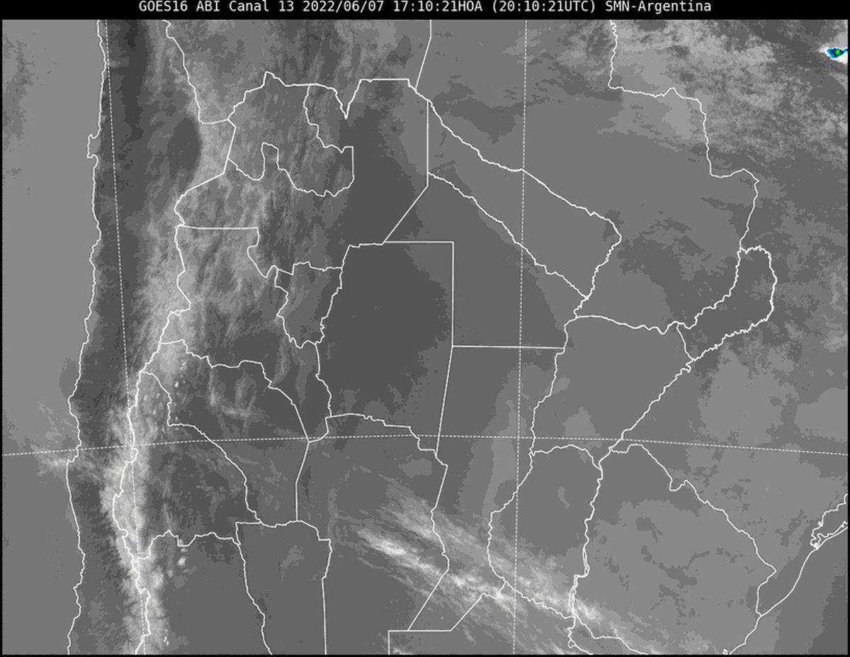 El técnico auxiliar en Meteorología de AIRE, Pablo Lucero, explicó que en la imagen satelital se observa que el borde este de la provincia continúa con nubosidad de baja altura (la niebla que afectó nuestra zona durante la mayor parte del día) pero, además, avanza desde el sur una franja de nubes que también se sumará durante la noche.