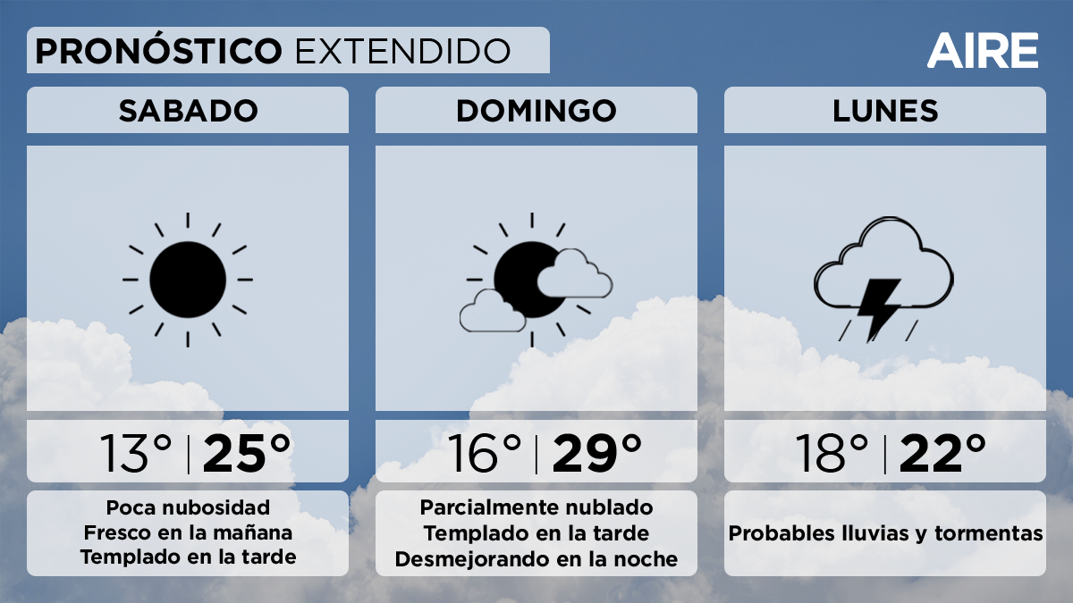 El domingo, en tanto, tendrá aumento de la nubosidad y hacia el final del día las condiciones volverán a desmejorar. “Ocurre que este retroceso de aire cálido y húmedo desde el noreste volverá a producir inestabilidad, con posibles lluvias y tormentas durante el lunes. Esto podría extenderse hasta las primeras horas del martes, cuando volverá a rotar el viento al sudeste. A partir de allí, habría pocos cambios en las condiciones en el resto de la semana. Predominará el cielo parcialmente nublado, viento del sudeste y las temperaturas se mantendrán entre 16° y 18° las mínimas, mientras que las máximas rondarían los 25° a 27°. No se descarta que en algún momento pueda ocurrir algunas precipitaciones aisladas, por lo que recomendamos estar atentos a las actualizaciones de este informe”, expresó Lucero.