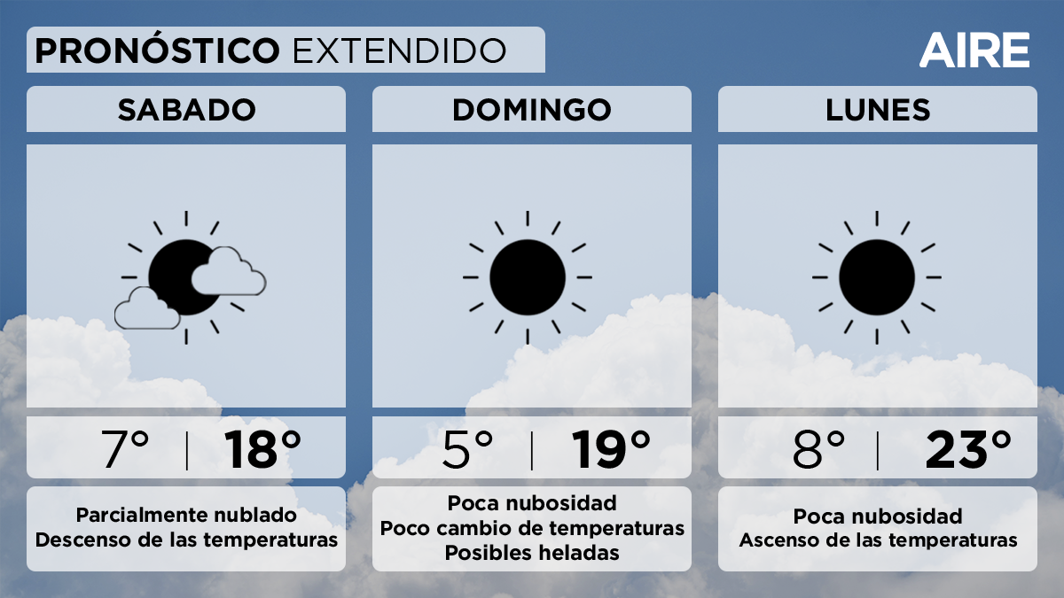 El domingo habrá poca nubosidad. Temperatura mínima de 5° con probables heladas en zonas con poca edificación, máxima de 19° y viento leve a moderado del noreste.