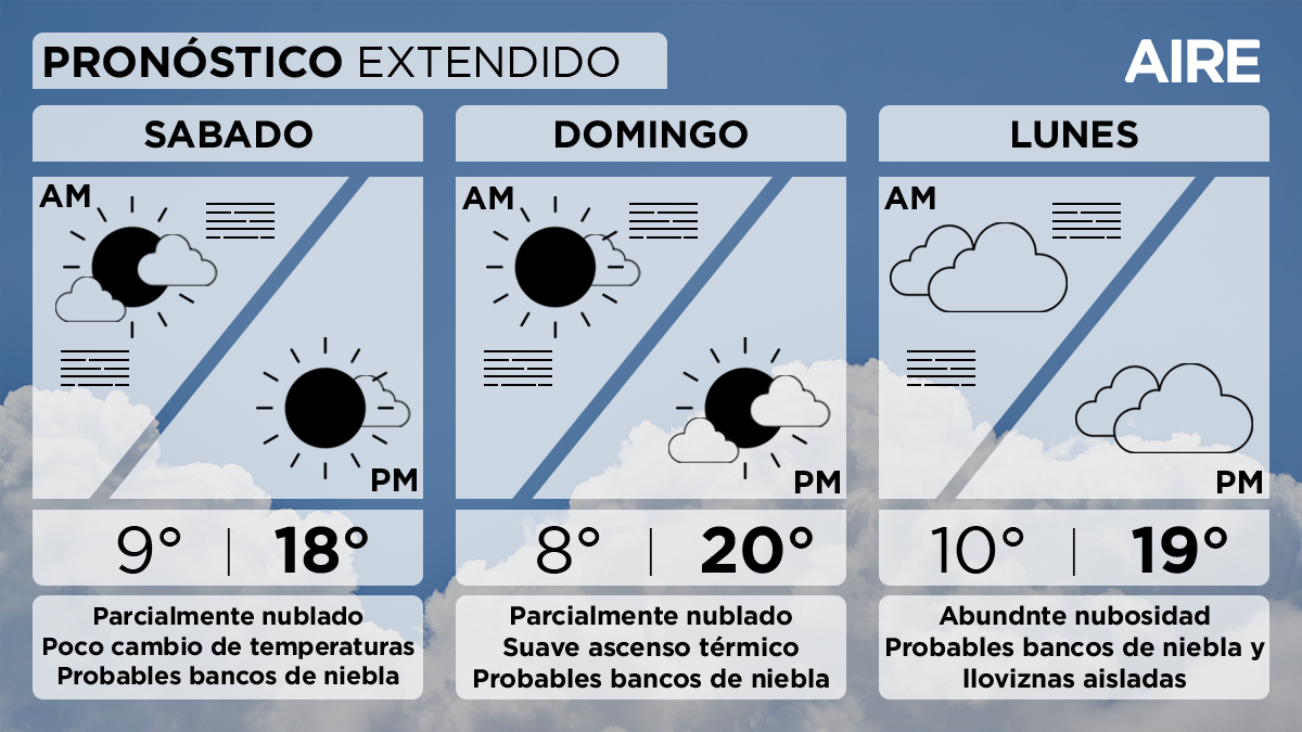 En tanto, adelantó que "posteriormente el desplazamiento al mar de otro centro, pero de alta presión, ingresará aire cálido y húmedo desde el Atlántico. Este ingreso de aire desde el noreste producirá aumento de la nubosidad y una baja probabilidad de algunas lloviznas aisladas. Esta situación se extendería hasta el miércoles, manteniendo condiciones bien otoñales en la despedida de esta estación".