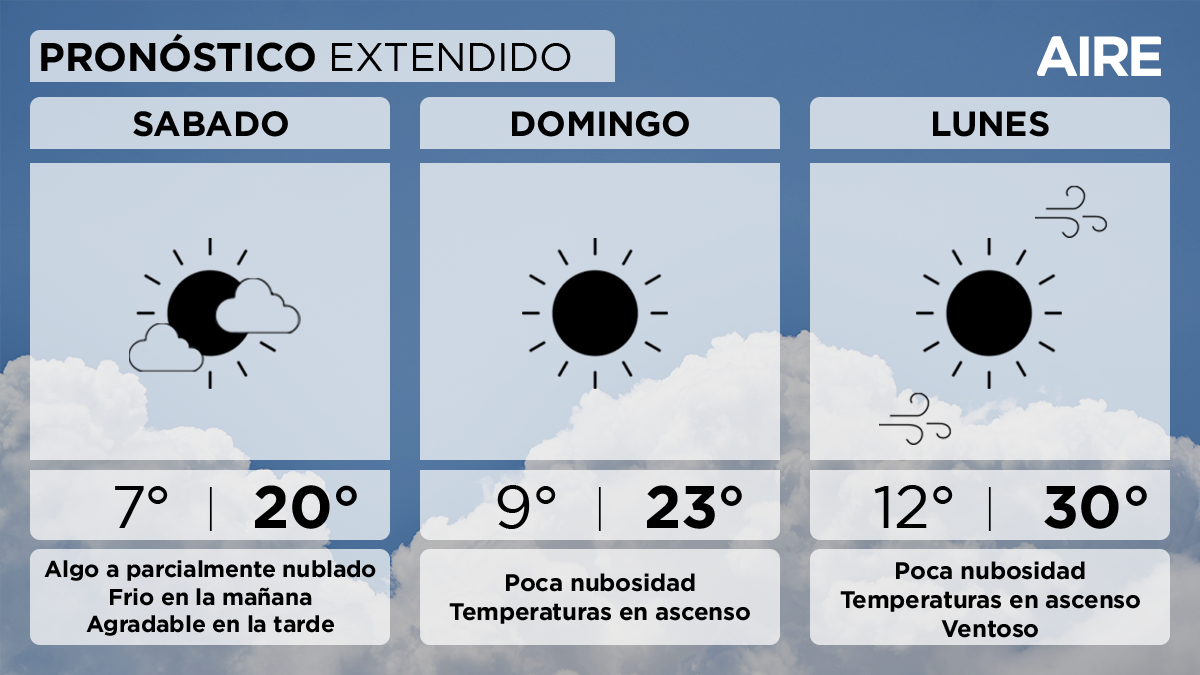 El lunes también estará despejado o con poca nubosidad. Temperatura mínima de 12°, máxima de 30° y viento leve a moderado del norte con probables ráfagas de mayor intensidad.