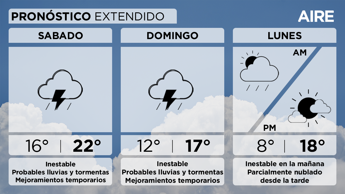El domingo continuarán las condiciones inestables con probables lluvias y tormentas. Temperatura mínima de 12°, máxima de 17° y viento leve a moderado del sudeste con posibles ráfagas de mayor intensidad.