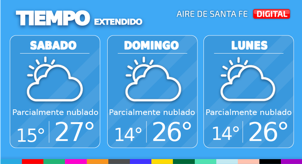 En la ciudad de Santa Fe, el sábado habrá cielo parcialmente nublado. Temperatura mínima de 15°, máxima de 27° y viento leve a moderado del noreste. Por otra parte, el domingo continuará el cielo parcialmente nublado. Temperatura mínima de 14°, máxima de 26° y viento leve a moderado del noreste.