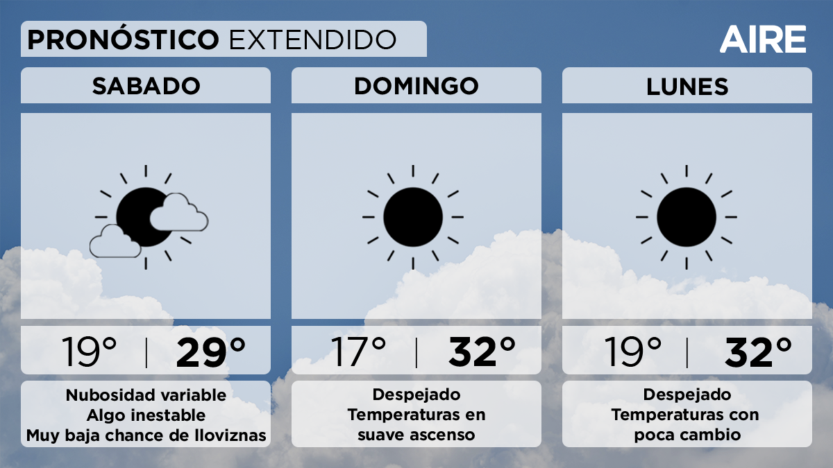 El experto en clima Pablo Lucero indicó que "en la imagen satelital se observa que continúa con poca nubosidad en toda la región. Los efectos de un centro de alta presión en la costa atlántica de la provincia de Buenos Aires mantienen estables las condiciones en gran parte del centro y norte del país. Sin embargo, este sábado tendrá nubosidad variable, y una posible perturbación en capas medias de la atmósfera podría producir alguna llovizna aislada, sobre todo en horas de la tarde".