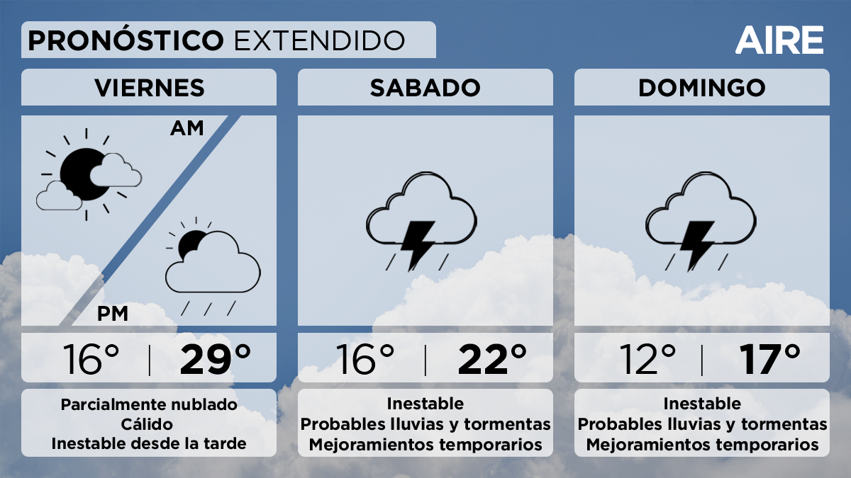 El sábado las condiciones serán inestables, con probables lluvias y tormentas alternadas con mejoramientos temporarios. Temperatura mínima de 16°, máxima de 22° y viento leve a moderado del sur con posibles ráfagas de mayor intensidad.