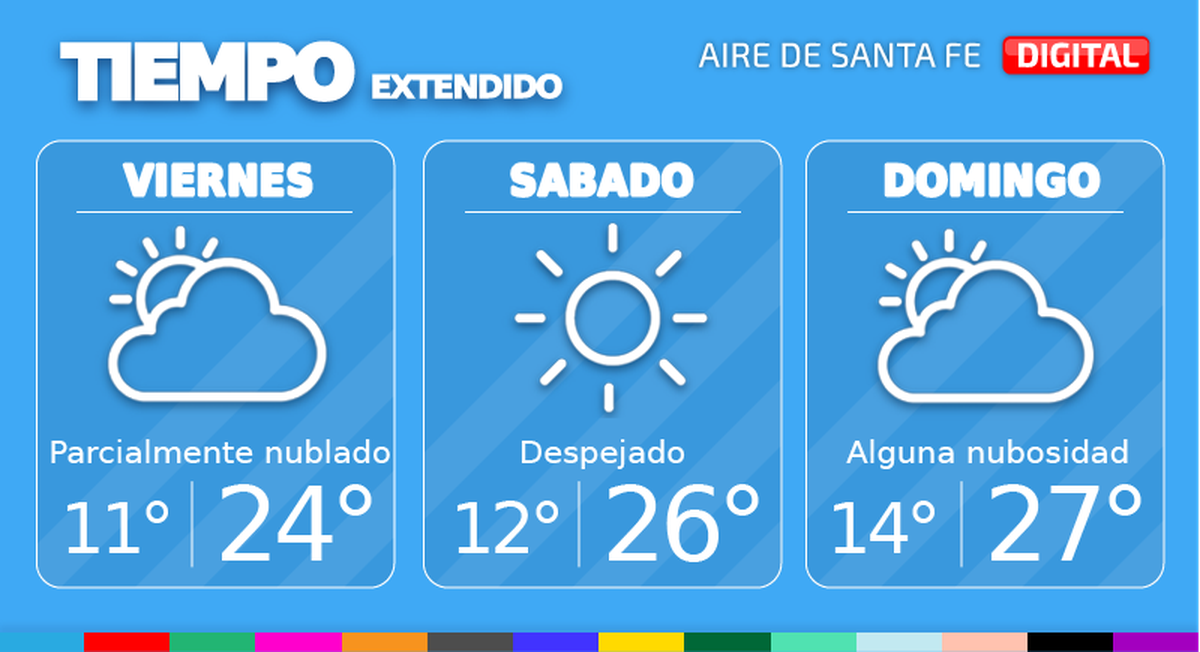 Sábado: se pronostica una jornada a pleno sol, con cielo despejado. Temperatura mínima de 12°, máxima de 26° y viento leve del noreste.
