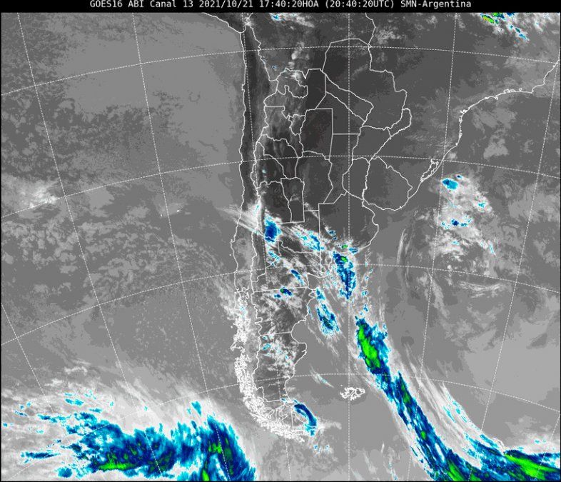 En la imagen satelital se observa que el cielo todavía continúa con poca nubosidad en nuestra provincia. Se visualiza también la zona de inestabilidad que produce el frente de aire frío en las provincias de La Pampa, sur de Buenos Aires, sur de Mendoza, Neuquén y Río Negro.