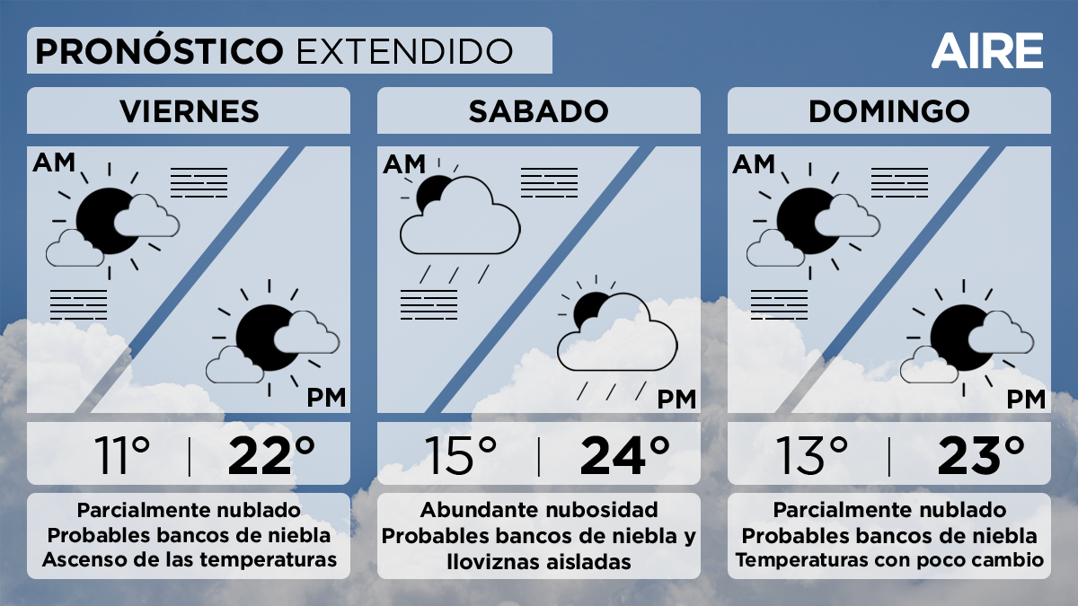 El sábado tendremos abundante nubosidad y baja probabilidad de lloviznas aisladas. Temperatura mínima de 15°, máxima de 24° y viento leve a moderado del noreste rotando al sudeste.
