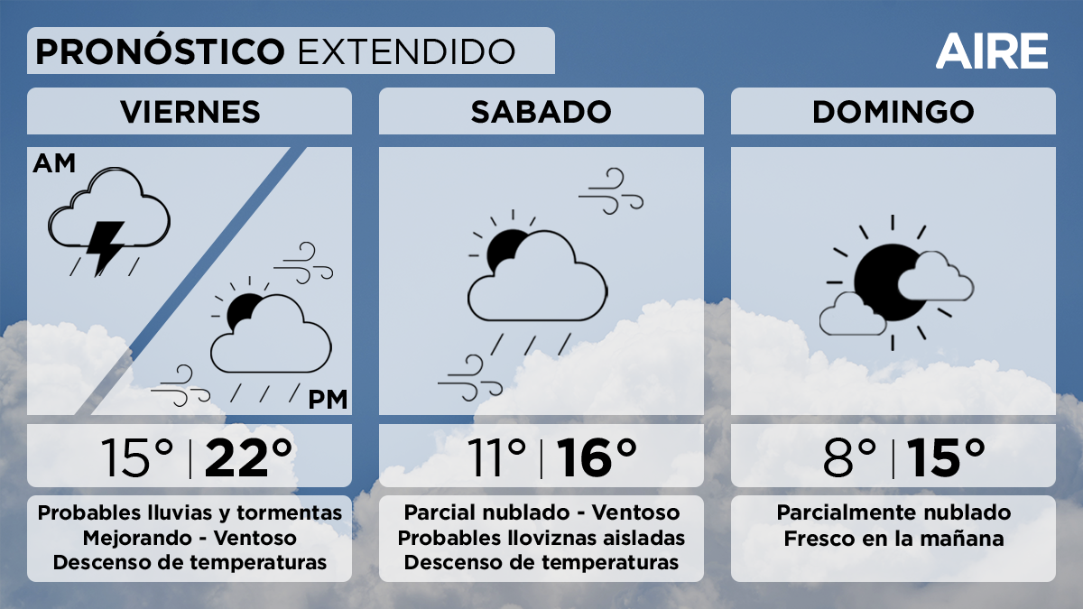 Sin embargo, aseguró que "previo a eso, al acercarse el frente, volverá a avanzar la inestabilidad hacia el norte, causando algunas lluvias y tormentas nuevamente en nuestra zona. Estas condiciones se extenderían en las primeras horas del viernes. En la tarde, con la rotación del viento al sudoeste, las condiciones mejorarán y comenzarán a descender los valores térmicos. También podrán registrarse importantes ráfagas de viento, que se extenderían en la jornada del sábado".
