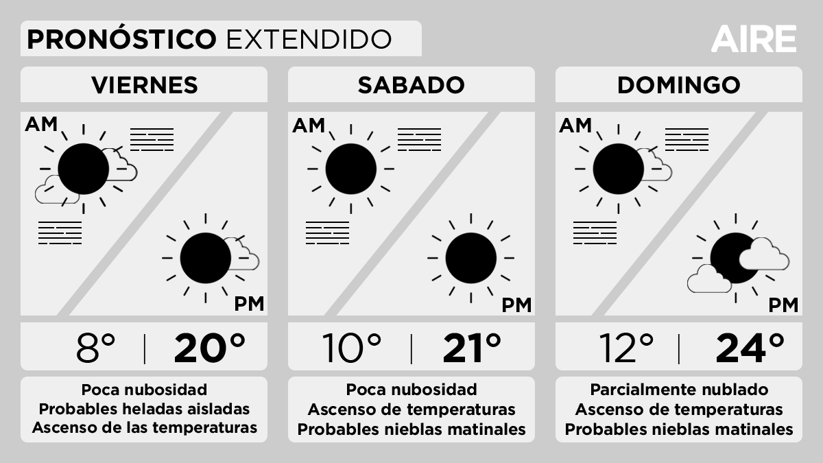El sábado continuaremos con poca nubosidad. Temperaturas en ascenso con mínima de 10°, máxima de 21° y viento leve a moderado del noreste con probables ráfagas de mayor intensidad.