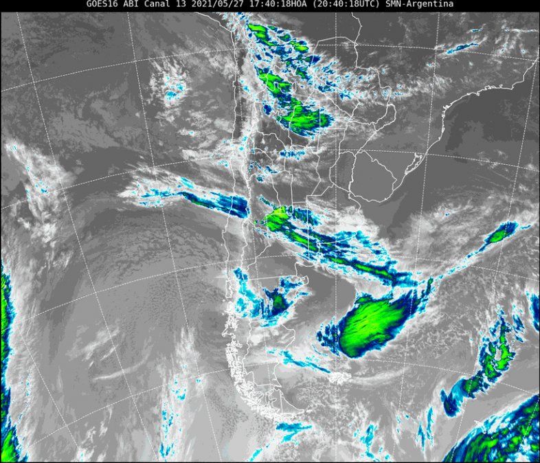 En la imagen satelital se observa abundante nubosidad ingresando a la provincia desde el noroeste. Por otro lado, se visualiza el frente de aire frío que avanza desde el sur del país atravesando la provincia de La Pampa.