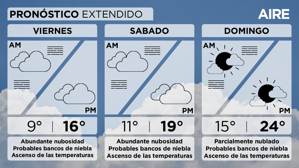 El sábado continuaremos con abundante nubosidad. Temperaturas en ascenso con mínima de 11°, máxima de 19° y viento leve a moderado del noreste.