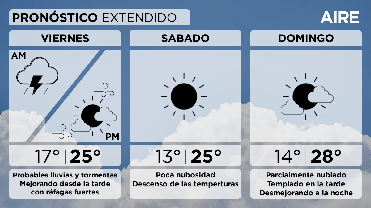 Este viernes en la ciudad de Santa Fe y alrededores, las condiciones climáticas volverán a ser inestables. Por la mañana se esperan probables lluvias y algunas tormentas, pero el tiempo mejorará desde la tarde. Las temperaturas irán en descenso con mínima de 17° hacia final de la jornada, 20° por la mañana, una máxima de 25° y viento leve a moderado del sur con posibles ráfagas fuertes.