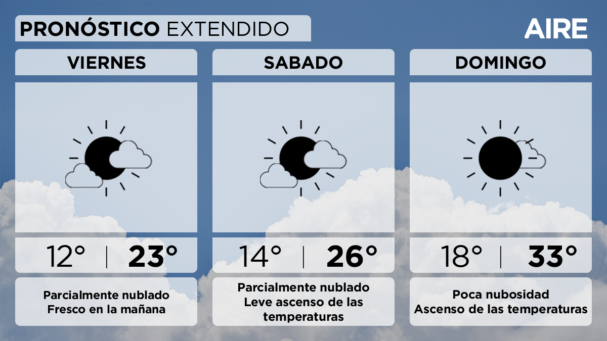 El sábado continuará con cielo parcialmente nublado. Temperatura mínima de 14°, máxima de 26° y viento leve a moderado del este.