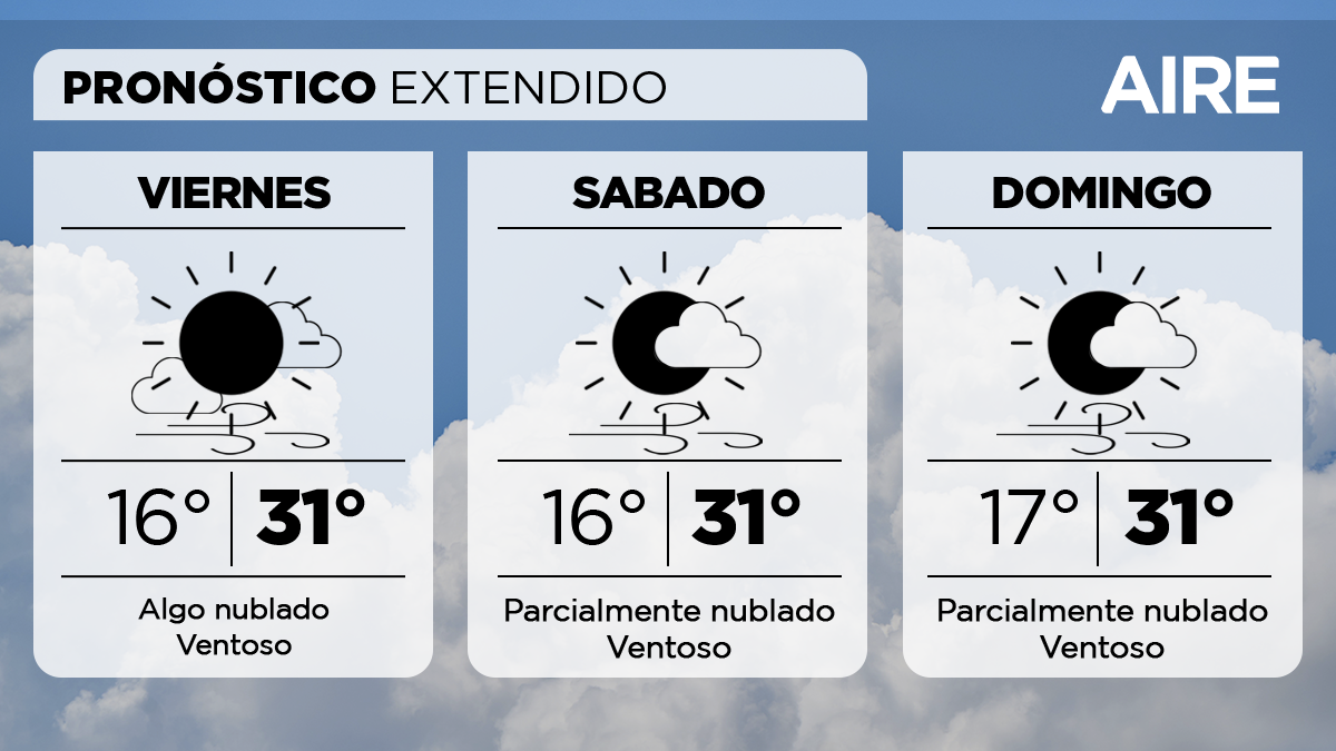 El fin de semana tendrá similares condiciones. El sábado se presentará parcialmente nublado, con una mínima de 16°, una máxima de 31° y viento leve a moderado del noreste.