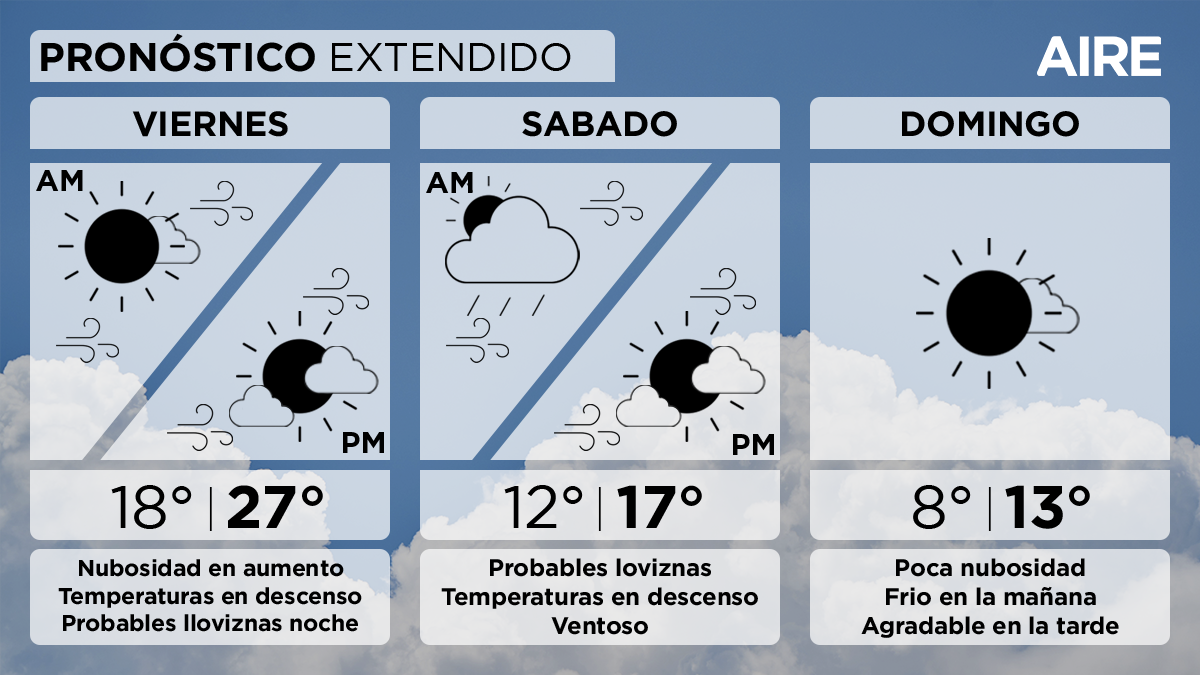 El sábado habrá abundante nubosidad y no se descartan algunas lloviznas en la primera parte del día. Temperaturas que continuarán descendiendo con mínima de 12° a final de la jornada, 15° por la mañana, máxima de 17° y viento leve a moderado del sur con posibles ráfagas de mayor intensidad.