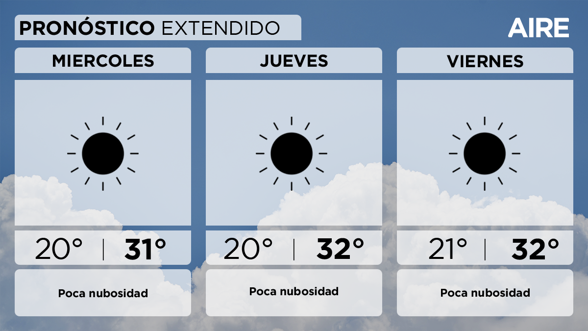El jueves el cielo también estará con poca nubosidad. Leve ascenso de las temperaturas con mínima de 20°, máxima de 32° y viento leve a moderado del noreste.