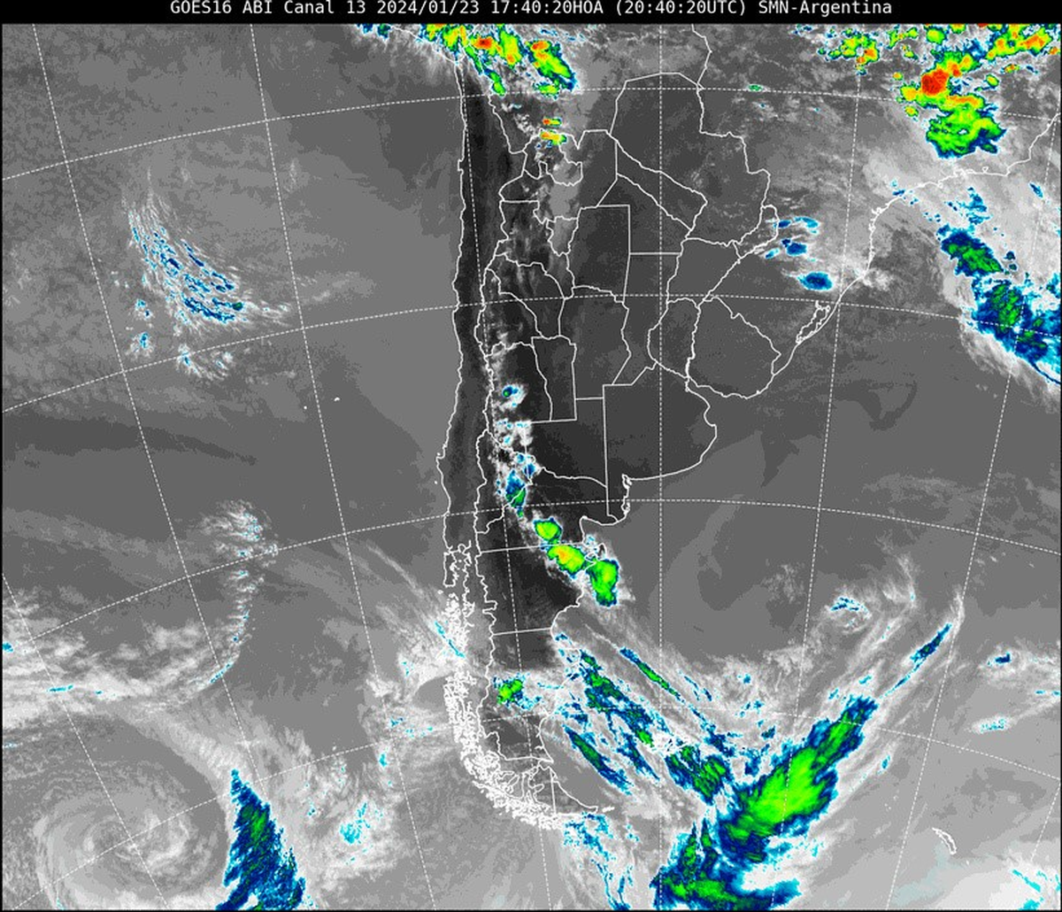 En la imagen satelital se observa que gran parte del territorio nacional continúa libre de nubosidad. Los efectos de una gran área de altas presiones, formada por dos grandes centros de alta presión (uno en cada océano) mantienen estables las condiciones. Además, esto forma un “bloqueo” que no deja ingresar aire frío desde el sur, pero tampoco aire cálido desde el norte.