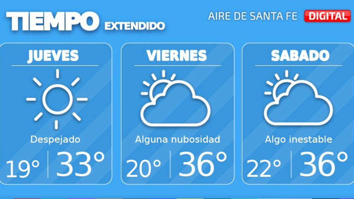 Mañana viernes el cielo con alguna nubosidad y nuevamente condiciones algo inestables hacia la noche. Temperaturas en nuevo aumento con mínima de 20°, máxima de 36° y viento leve de direcciones variables.