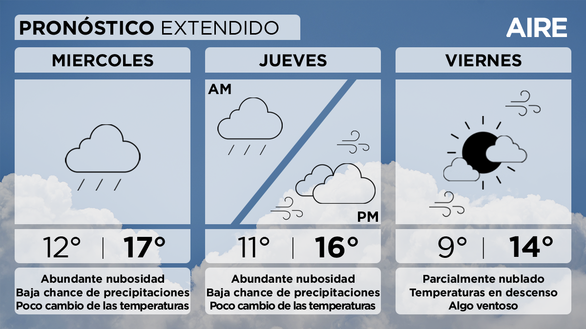 - Sábado 25 de mayo: continuará el cielo parcialmente nublado. Temperatura mínima de 6°, máxima de 14° y viento leve a moderado del sudeste.