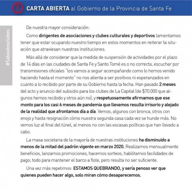 "No no alientan a ser positivos ni esperanzados en cuanto a lo recibido por parte de su gobierno hasta la fecha", sostuvieron los dirigentes de asociaciones y clubes culturales y deportivos de Santa Fe en el documento. "Han pasado dos meses del acto y anuncio del subsidio para clubes en La Capital (de $70.000 que algunos hemos recibido y otro aún no), y respetuosamente afirmamos que ese monto para los casi 6 meses de pandemia que llevamos resulta irrisorio y alejado de la realidad que afrontamos día a día", afirmaron.