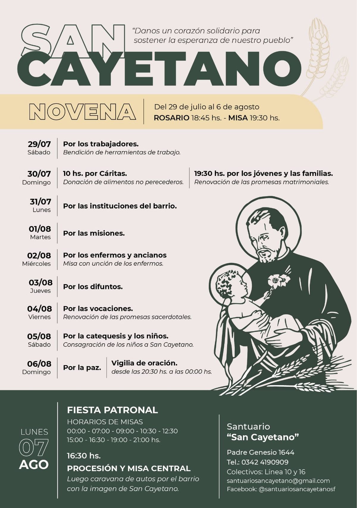 Este lunes 7 de agosto se celebra San Cayetano en Santa Fe en la parroquia que lleva el mismo nombre, ubicada en Padre Genesio 1644. Las actividades comenzaron a la medianoche con la celebración de la primer misa. La misa central se realizará a las 16.30 y contará con la participación del Obispo de Santa Fe, Sergio Fenoy. Luego la caravana de autos recorrerá las calles del barrio con la imagen del santo.