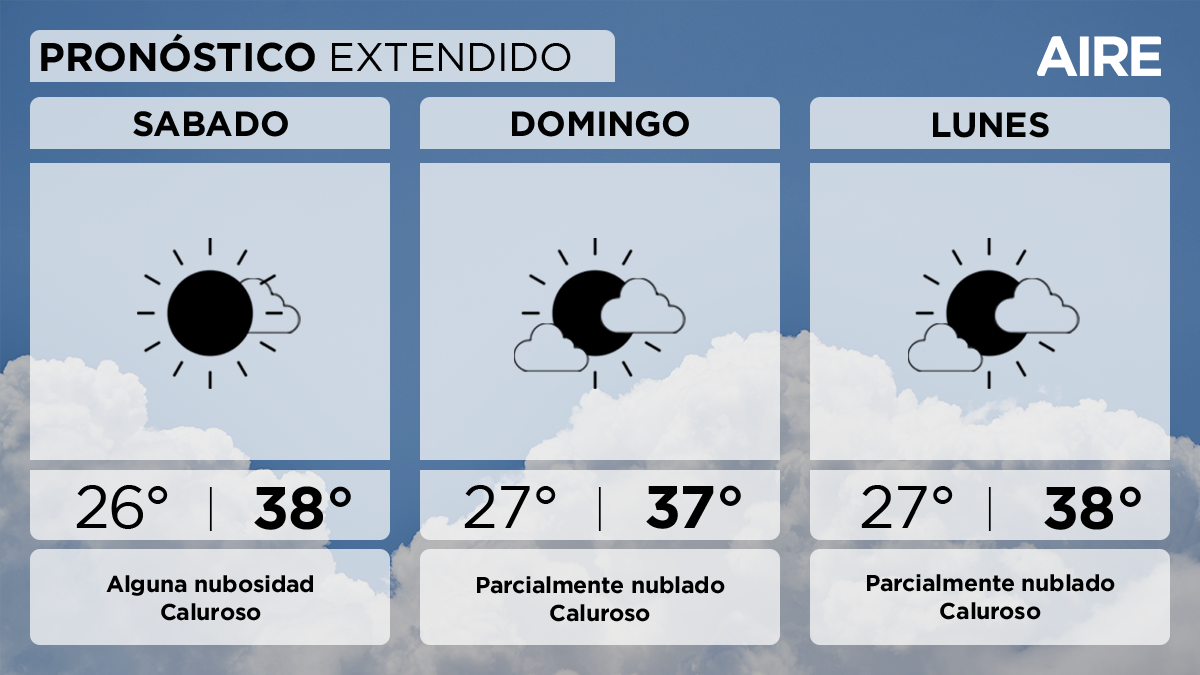 El lunes también habrá cielo parcialmente nublado. Temperatura mínima de 27°, máxima de 38° y viento leve a moderado del noreste.