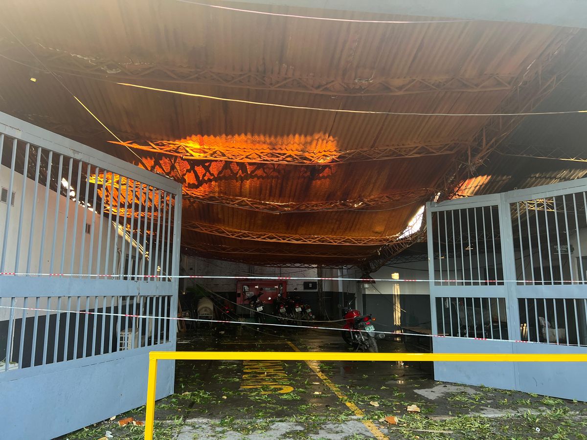 El techo de la Municipalidad de Funes cedió tras el temporal. En las impactantes imágenes, se observa cómo está el tinglado de la zona donde funciona Control Urbano, que cuenta con centro de comunicaciones y de monitoreo, y se guardan las camionetas de trabajo.