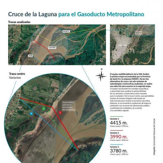Como explicó el director del Proyecto, Hugo Prendes, “el informe presentado a la Provincia incluye un análisis amplio de tres zonas alternativas para realizar el cruce de la Laguna Setúbal y seis variantes de metodologías constructivas. Los estudios se realizaron en forma articulada con expertos de Enerfe en construcción de gasoductos y se analizaron antecedentes y evaluaciones preliminares de cada caso, para evaluar ventajas y desventajas tanto desde el punto de vista constructivo, de ingeniería fluvial, de hidrología e hidráulica, geomorfología y geología, catastral y socioambiental”.
