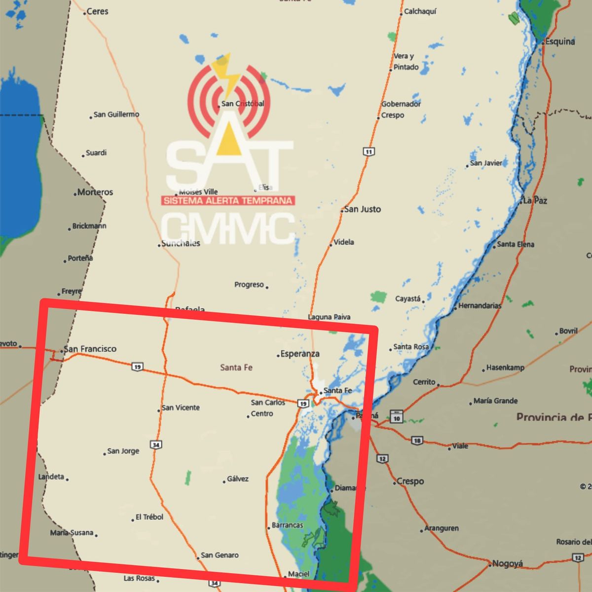 El aviso abarca a todo la región centro de la provincia e incluye a las localidades como Santa Fe, San Vicente, San Carlos Centro, Esperanza, San Francisco, Landeta y alrededores.