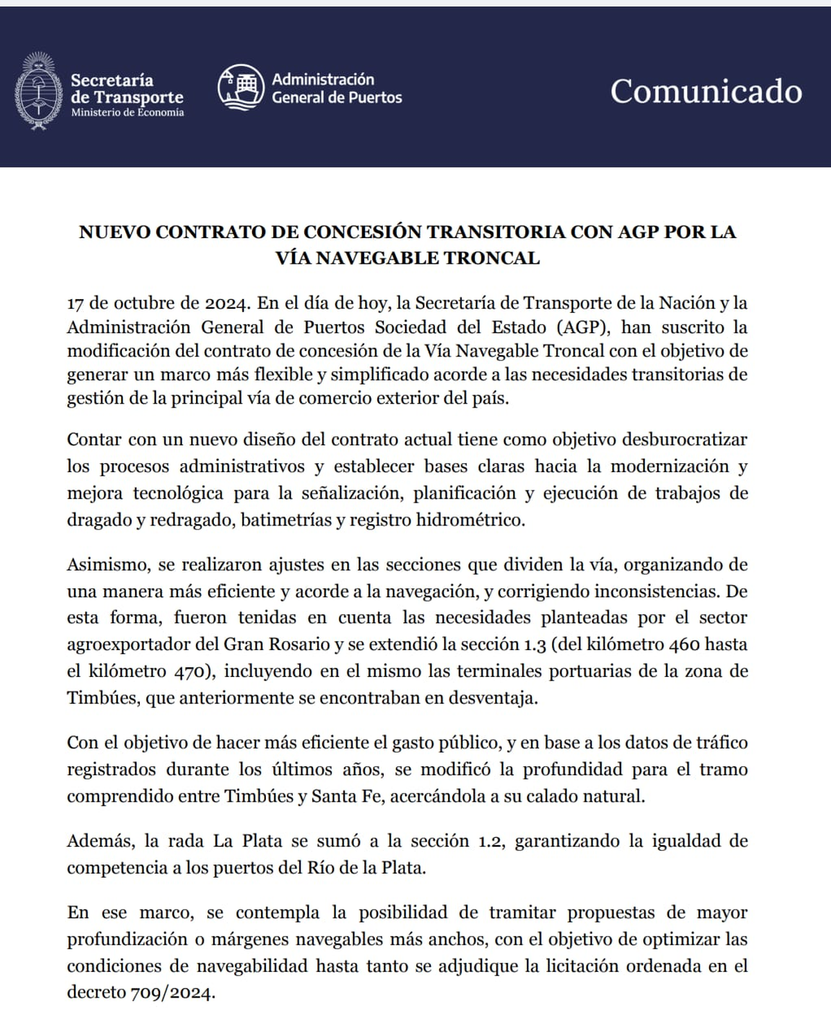 El gobierno nacional, a través de la Secretaría de Transporte de la Nación y la Administración General de Puertos (AGP), hizo modificaciones en el contrato de concesión de la hidrovía Paraguay-Paraná. Por allí salen y se exporta el 80% de los granos de todo el país.