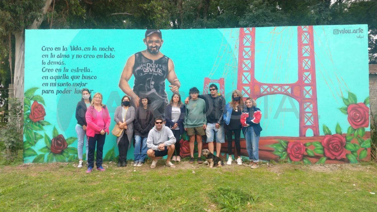 El mural recrea una fotografía de Bustos corriendo en una maratón en el Puente Colgante. "A José le gustaba mucho la banda Callejeros, Don Osvaldo, el rock nacional, el Puente Colgante, las rosas, la naturaleza...hicimos un combo de todo", dijo Andrea, su esposa, sobre las figuras que rodean la imagen de José en el mural.