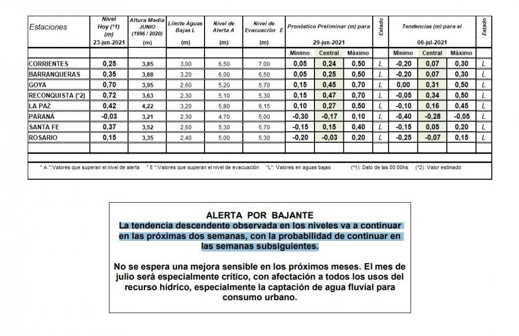 En la proyección “de mínima” del INA -que se publicó este miércoles 23 de junio- se advierte que la bajante podría perforar el cero del hidrómetro en el puerto santafesino en los próximos días. La última vez que esto sucedió fue en 1969 (- 0,15 metros).