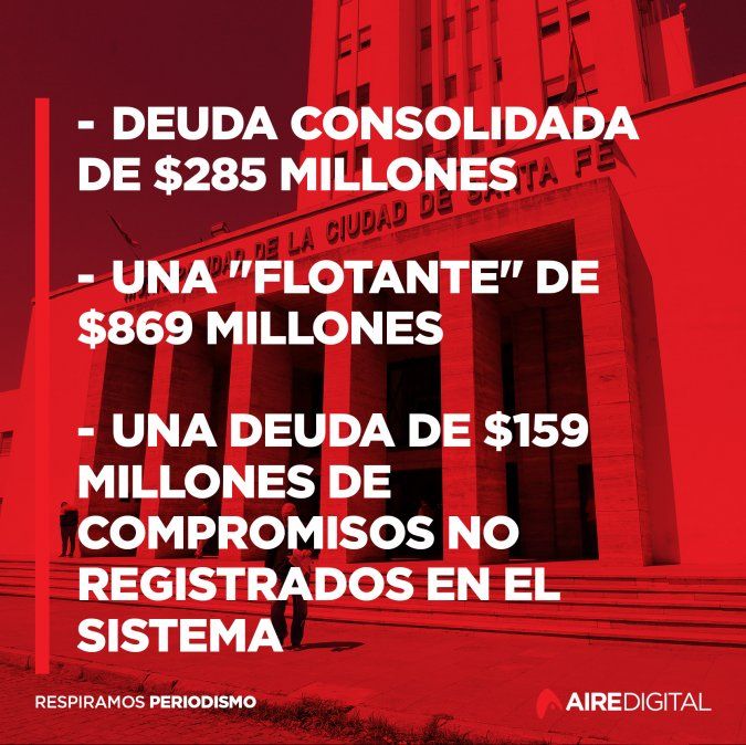 Piedrabuena precisó que "el rojo" en las cuentas está conformado por una deuda consolidada de $285 millones (la que viene de años anteriores, con préstamos a largo plazo y convenios de pago) y una "flotante" de $869 millones, que son los compromisos que asumió este año el Municipio y que todavía no pago. También hay una deuda de $159 millones de compromisos no registrados en el sistema al 11 de diciembre.