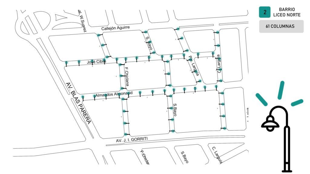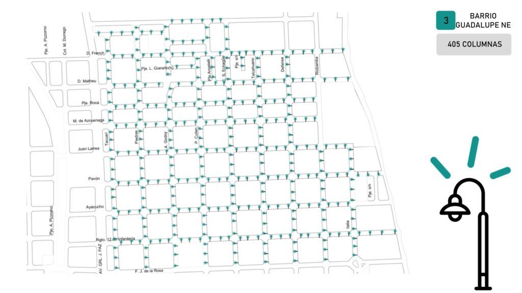 Sobre las intervenciones de nueva iluminación, la primera etapa contempla cinco sectores que serán beneficiados, al menos en un principio: Scarafía, donde se instalarán 100 columnas con luminarias LED con una inversión cercana a los 10 millones de pesos; Liceo Norte, donde se instalarán 61 columnas con una inversión de $ 7.500.000; Santa Marta, con 84 columnas con una inversión de $ 9.500.000; Siete Jefes, cuyo proyecto consiste en colocar 310 columnas con un monto de inversión cercano a los 31 millones de pesos; y Guadalupe, al noreste, donde se instalarán 405 columnas con sus equipos LED, cableado y tableros, con una inversión cercana a los $ 40 millones.