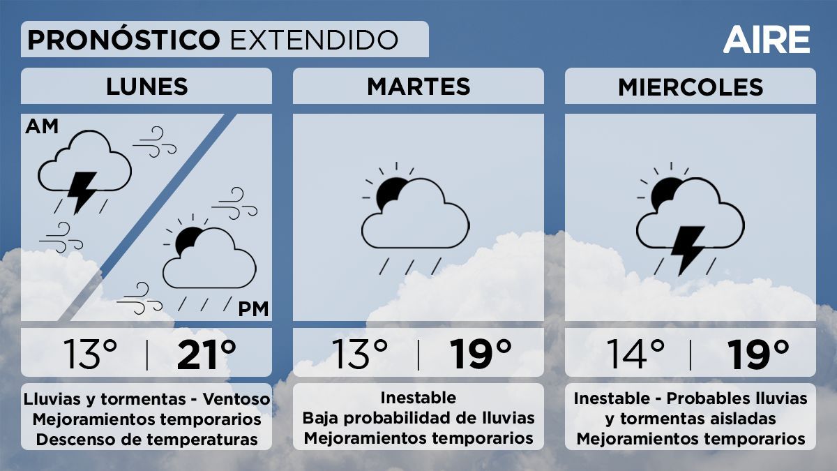 El lunes se presentará con inestabilidad y se esperan lluvias y tormentas alternadas con mejoramientos temporarios. Así lo afirmó el experto en clima de AIRE, Pablo Lucero. Las temperaturas irán en descenso, con una mínima de 13°, una máxima de 21° y viento leve a moderado del sudeste con posibles ráfagas fuertes.