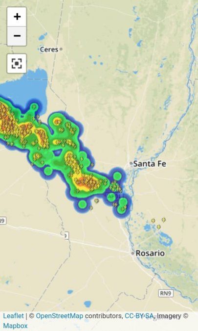 A las 19.00, así se visualizaba la actividad eléctrica en la zona cercana a la ciudad de Santa Fe: