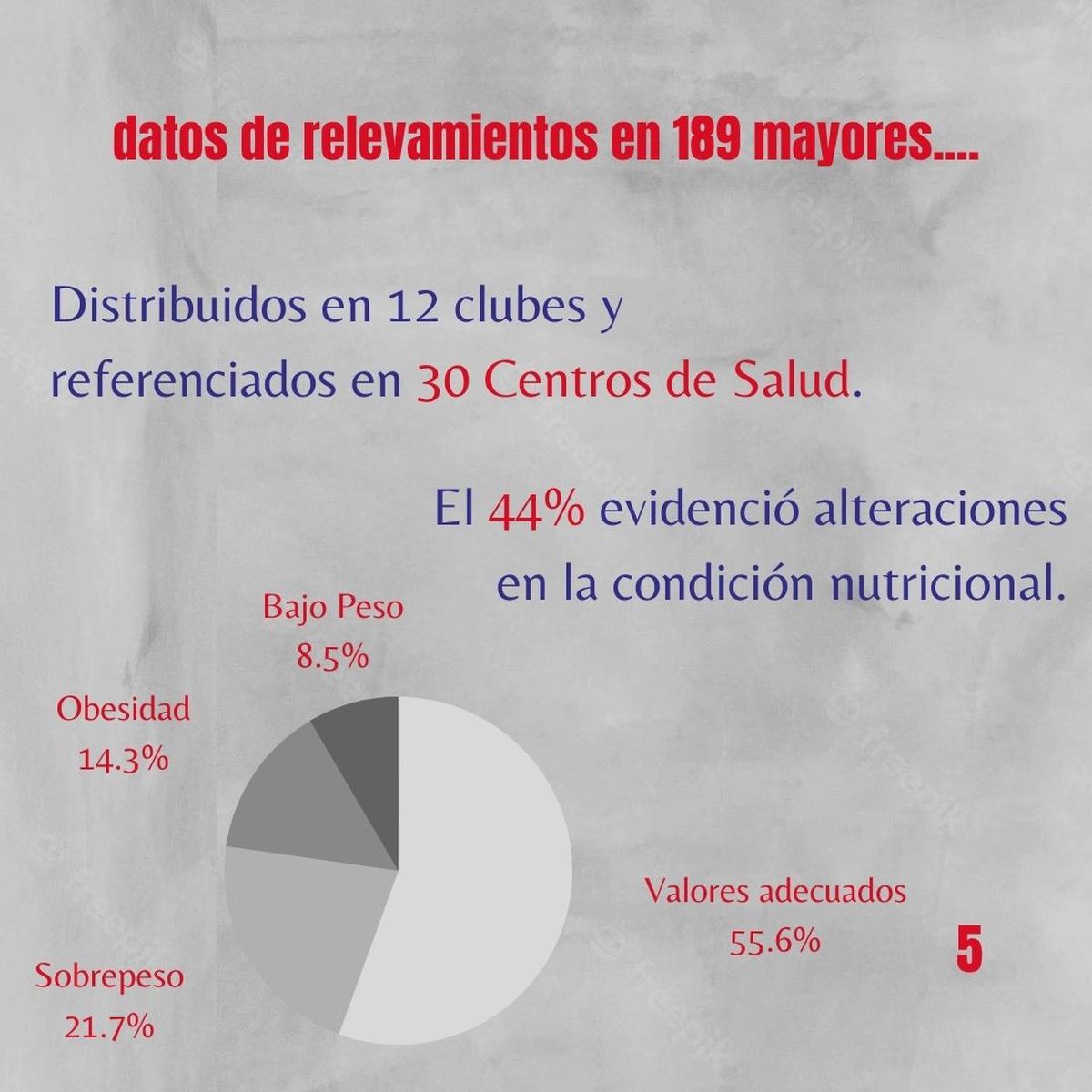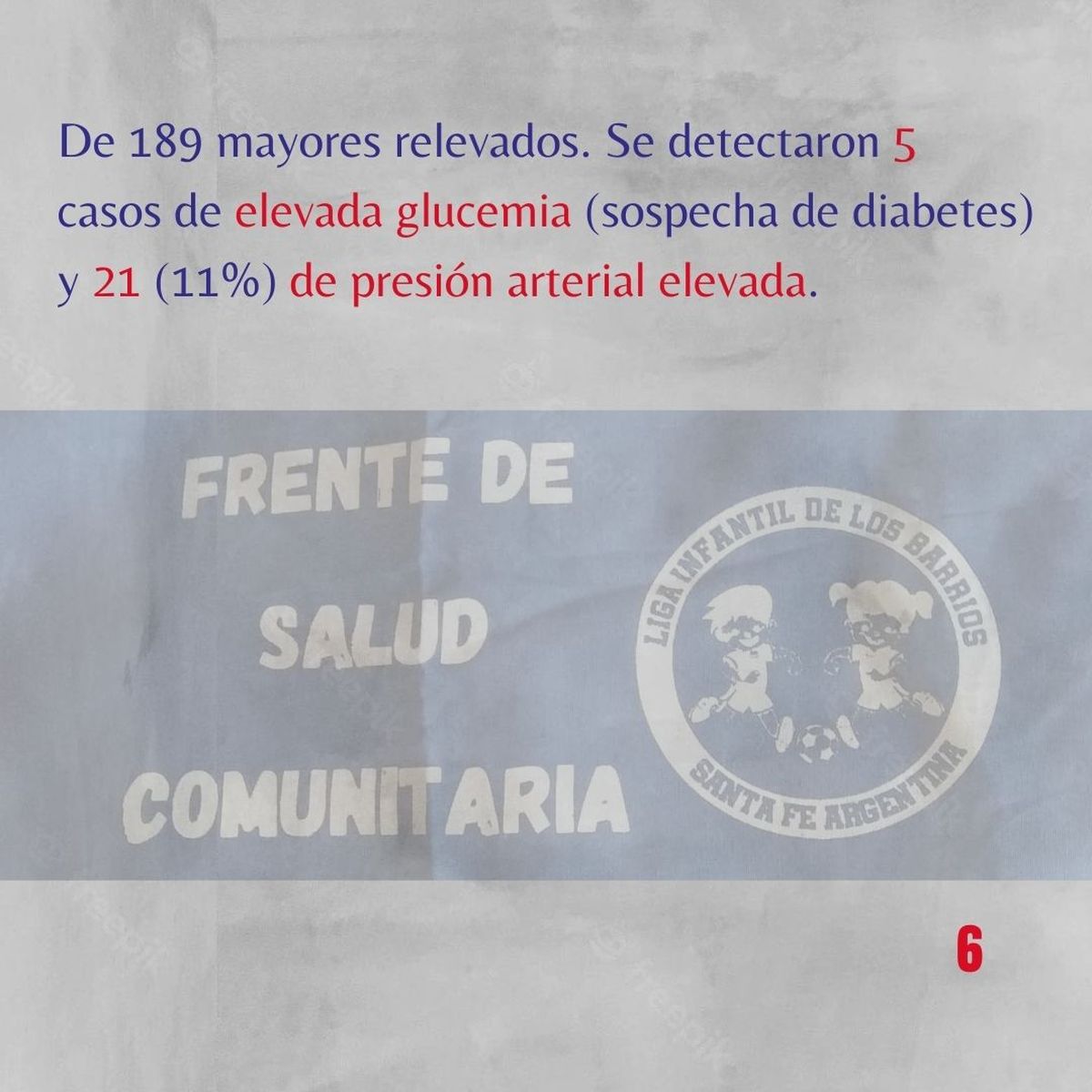 El 21.7% presentó sobrepeso, 14.3% obesidad y 8.5% bajo peso mientras que el 55.6% tenía valores adecuados. Se detectaron cinco casos de posibles casos de diabetes y 21 con presión arterial elevada. En lo que respecta a lo habitacional, el 80% no tiene acceso a cloacas, porque viven en barrios populares