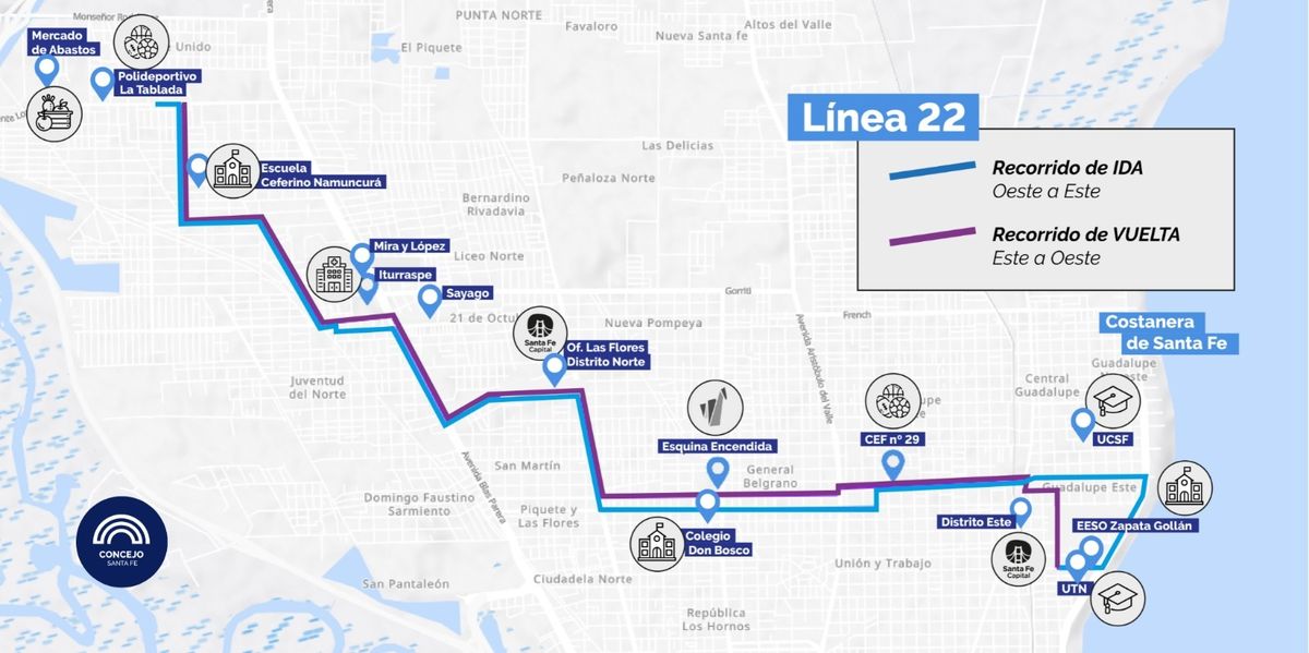 Días atrás, el Concejo de Santa Fe aprobó la creación de la línea 22, que atravesará la ciudad de oeste a este y pasará por lugares estratégicos como los hospitales Mira y López, Sayago y el Nuevo Iturraspe y dos universidades como la Católica y la Tecnológica, entre otros.