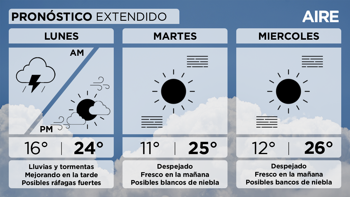 - Las condiciones continuarán inestables, con posibles lluvias y tormentas aisladas, pero mejorando en el transcurso de la tarde con nubosidad en disminución. Temperaturas en descenso, con mínima de 14° a final de la jornada, 16° por la mañana, máxima de 24° y viento leve a moderado del sudoeste, con posibles ráfagas de mayor intensidad.