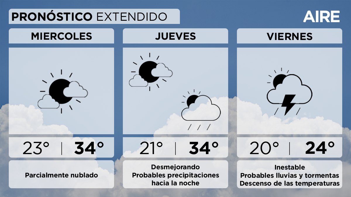 Temperatura mínima de 21°, máxima de 34° con elevada sensación térmica y viento leve a moderado del noreste rotando al sur hacia la noche.