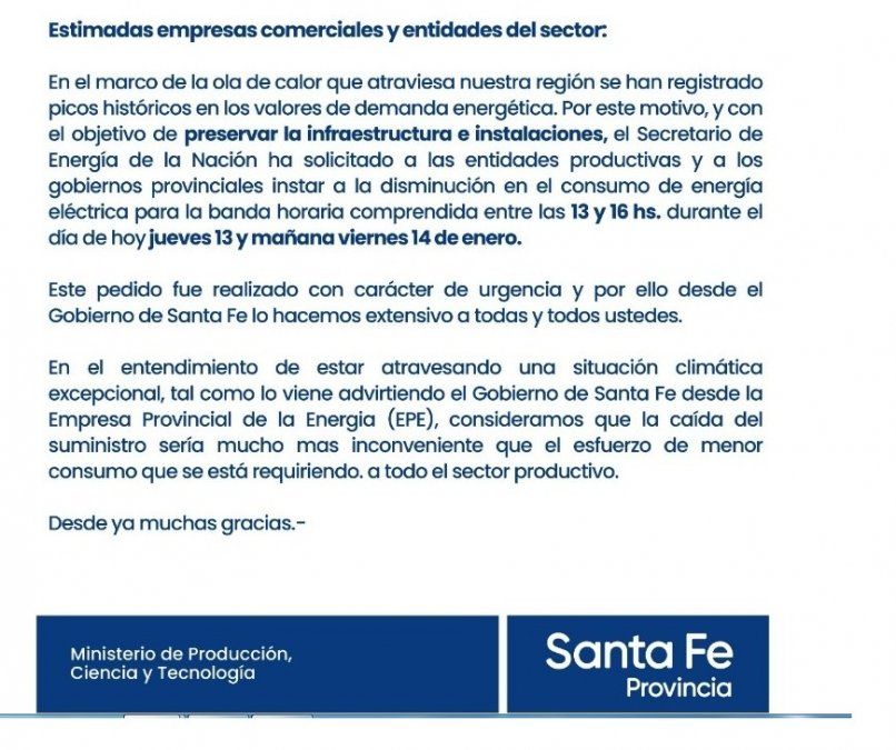 En el comunicado, desde la Provincia recordaron el pedido que realizó el Secretario de Energía de la Nación "con carácter urgente" a las entidades productivas de disminuir el consumo atento a la ola de calor y la demanda de consumo histórica que se está registrando.