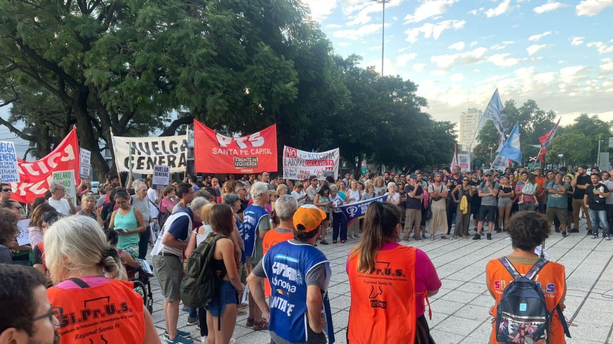 Un grupo de organizaciones sindicales, sociales y políticas se concentró este jueves por la tarde en la explanada de El Molino, en la intersección de bulevar Gálvez y Rivadavia, en la ciudad de Santa Fe, para expresar su rechazo a la reforma laboral que se debate actualmente en el Congreso Nacional.