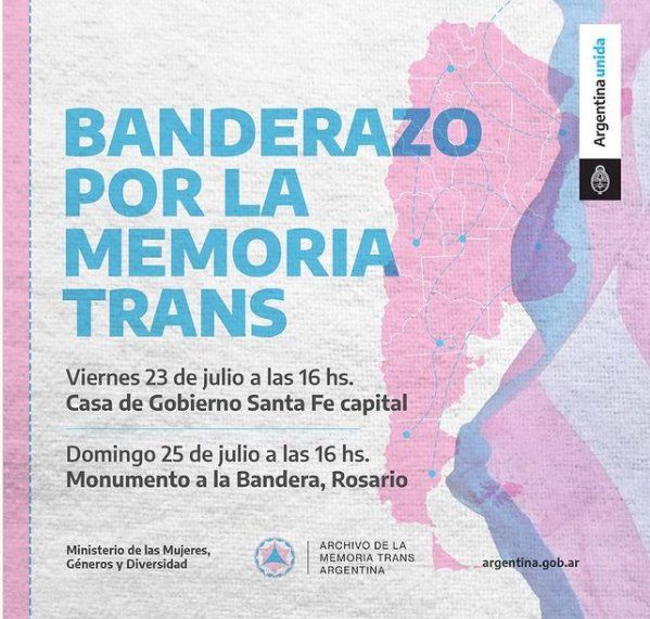 Este viernes 23 desde las 16, se desplegará frente a la Casa de Gobierno de Santa Fe un Banderazo por la Memoria Trans. La iniciativa se replicará en Rosario el domingo 25, también a las 16, al pie del Monumento a la Bandera. En ambos casos participarán de militantes y activistas trans locales. Es una acción federal propuesta por el Archivo de la Memoria Trans y acompañada por el Ministerio de Mujeres, Géneros y Diversidad de la Nación.